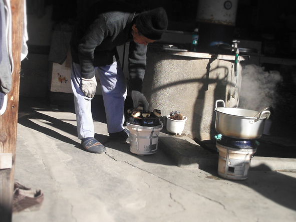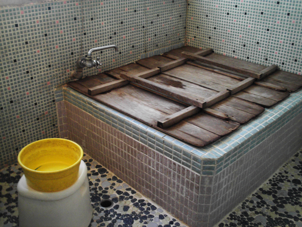 薪で沸かすので浴槽の底が大変熱いので下駄を履いて入ります。